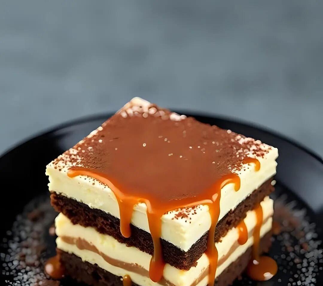 Drizzle the mascarpone cheese layer with caramel sauce.