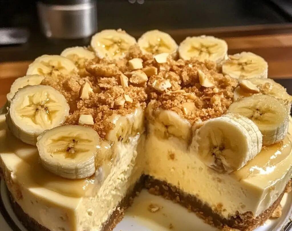 Place another layer of banana slices on top of the cheesecake filling, then gently spoon the rest of the banana pudding mixture over the top.