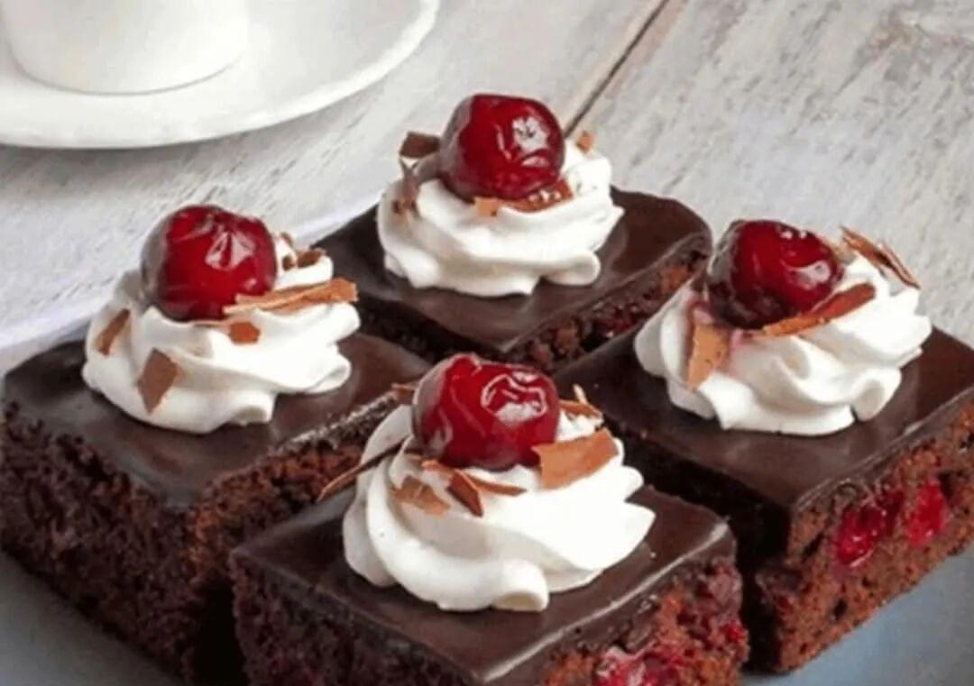Cut the cake. Whip the buttercream, decorate each cake square with buttercream, place a cherry on top of the whip cream, and sprinkle with chocolate chips if desired.