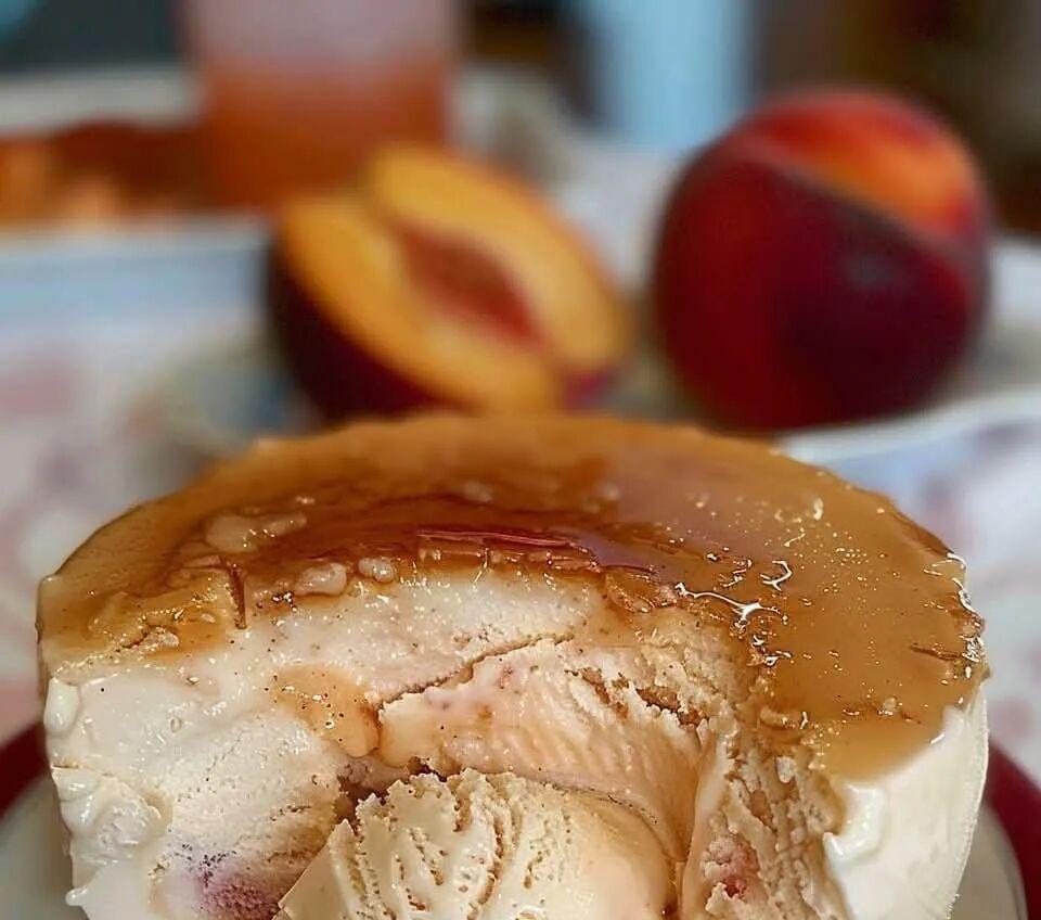 -Once the ice cream has reached the desired consistency, serve in a bowl or cone. Also garnish with fresh peaches if desired.