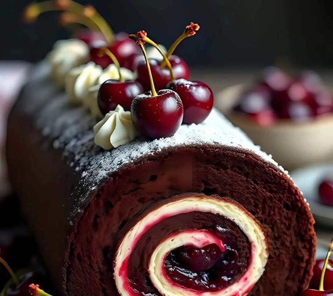 Assemble the cake: Spread the whipped cream over the cooled cake. The cherry filling is spooned on top. Roll the short end of the cake into a log. Let cool for 1 hour.