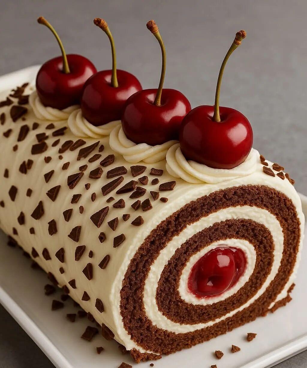 A fluffy chocolate sponge cake rolled with fragrant whipped cream and sweet cherries, garnished with creamy swirls, chocolate shavings and fresh fruit. This dessert makes people linger… and it makes people feel exciting.