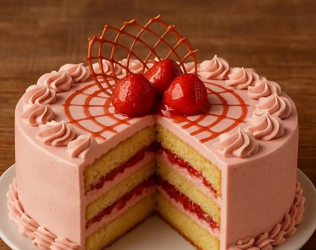 Fluffy sponge cake with strawberry buttercream, garnished with candied strawberries and buttercream cake details, ideal for celebrations or self-indulgence!
