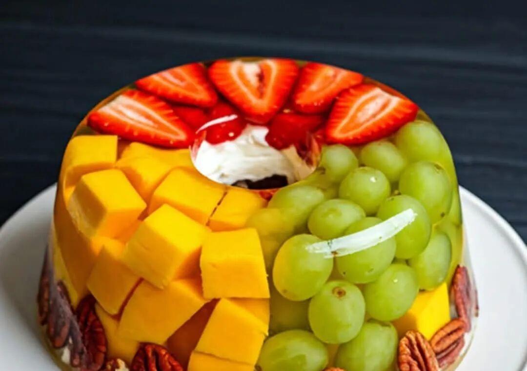 Then add the grapes, add a little more gelatin to seal the fruit, put it in the fridge for it to set, add the mango or papaya balls, then add the orange peel to give it a rich aroma (add these fruits or whatever else you like if you wish), and finally add the washed and crushed carrots or beetroot.