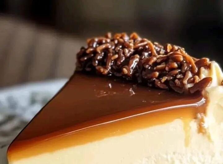 Using a knife, pour the cooled caramel sauce over the cooled and smooth cheesecake surface.