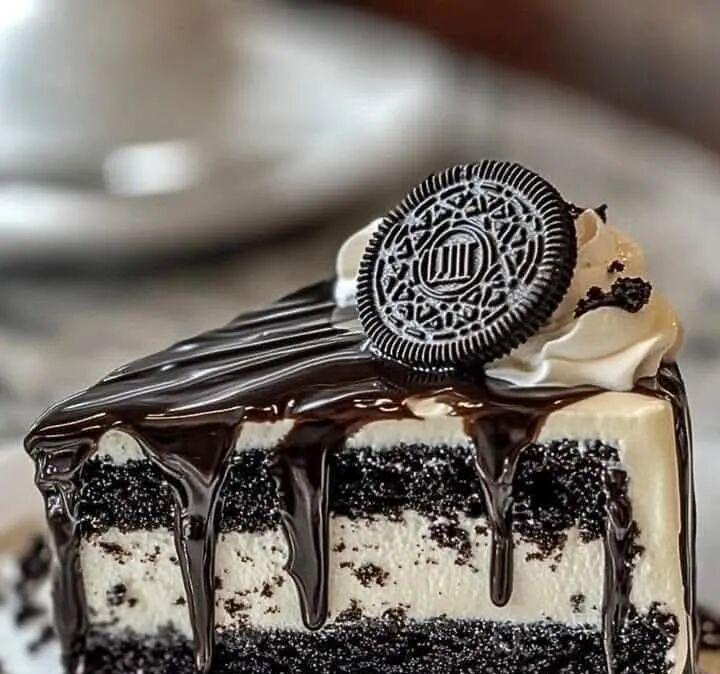 11. Before serving, sprinkle the cheesecake with crushed Oreo cookies. Finish with a drizzle of chocolate ganache on top of the cake to make the cake even more delicious.