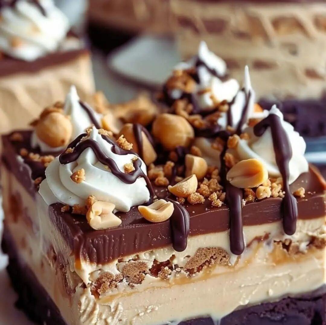 Garnish with whipped cream and whole peanuts before serving. Use parchment paper to lift the baking stick off the plate before cutting into squares.