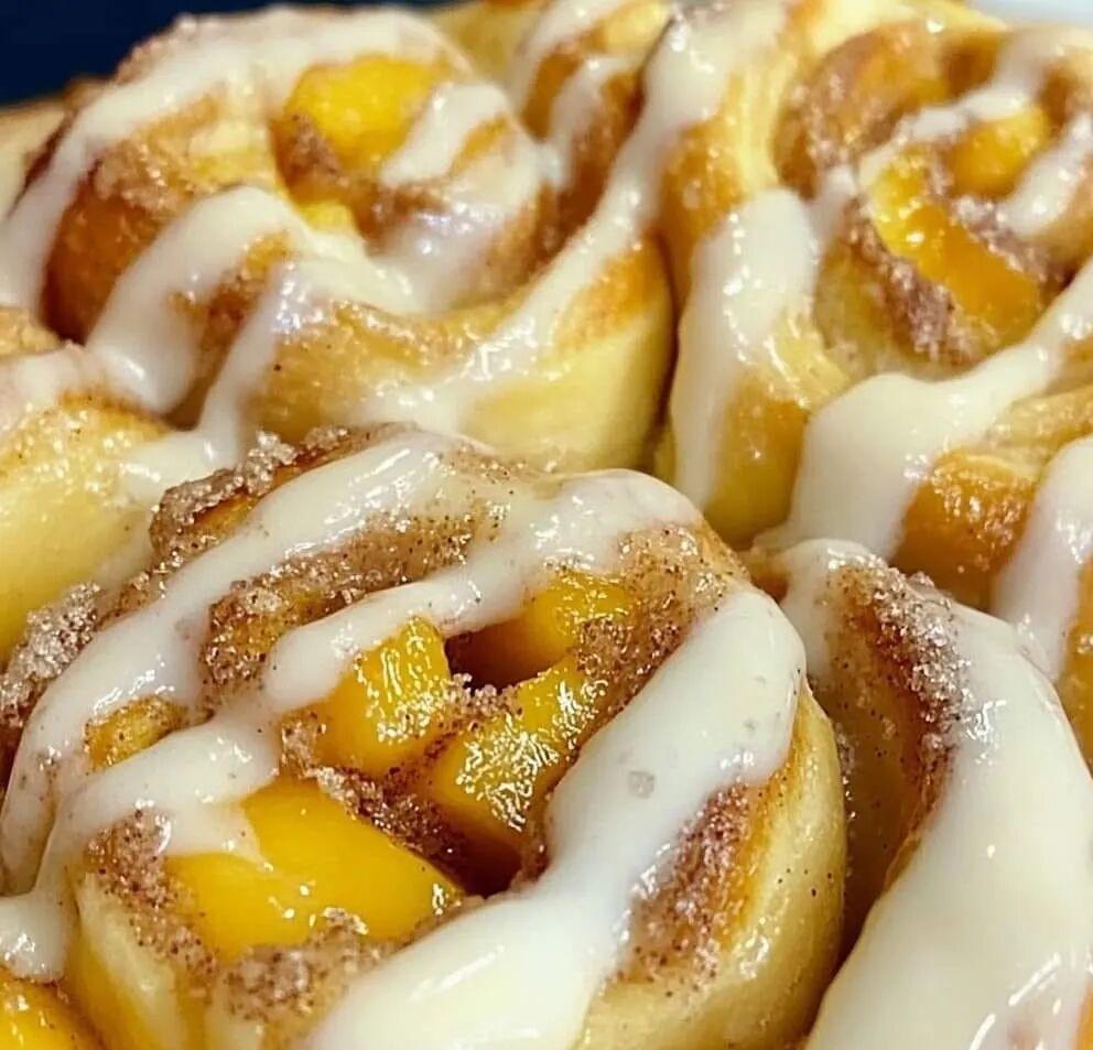 Sprinkle the diced peaches evenly over the cinnamon sugar mixture.