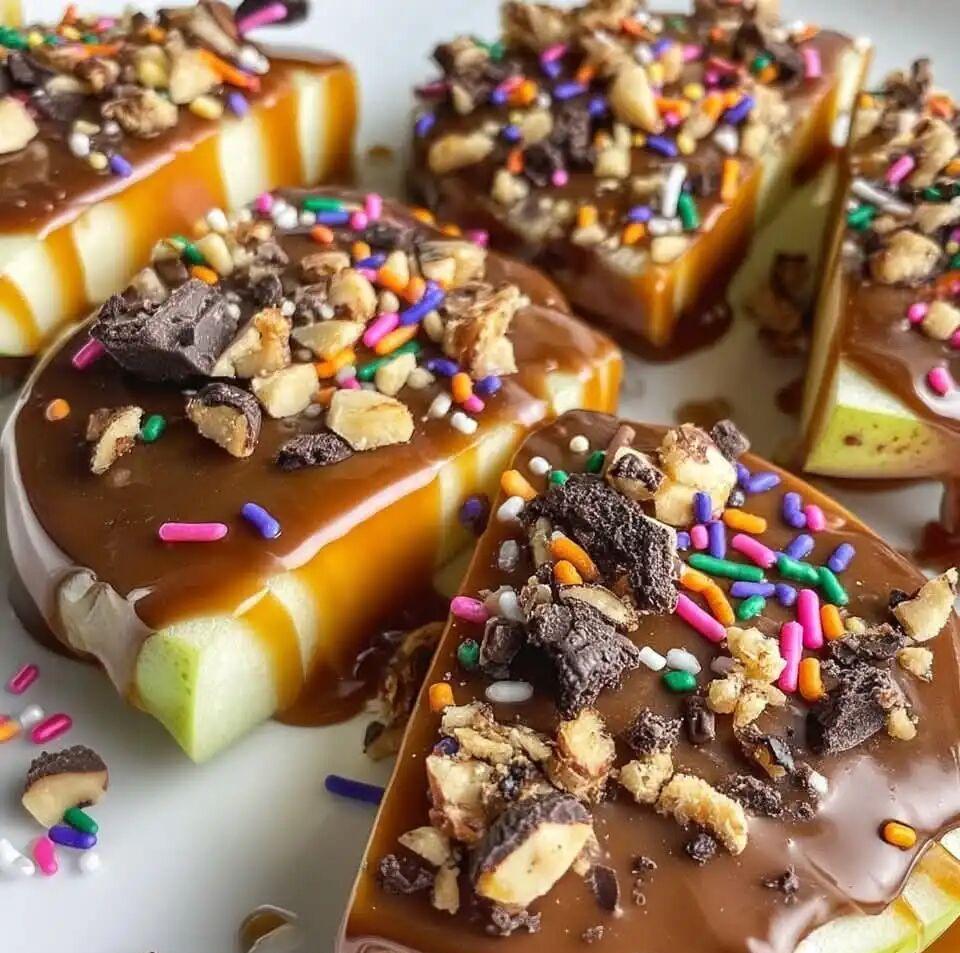 -Place the apple slices in the refrigerator for at least 30 minutes to allow the chocolate and caramel to harden before serving.