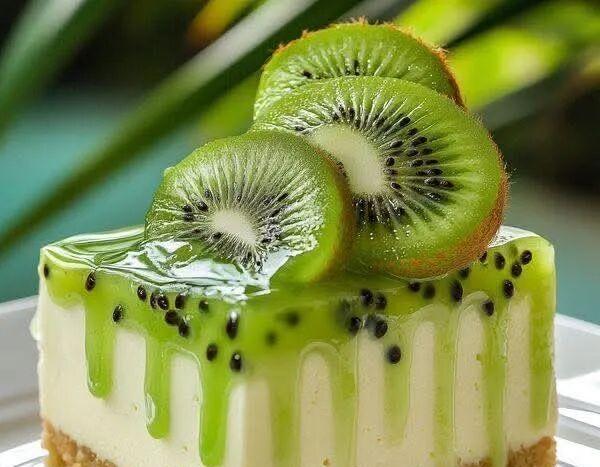 8. Place the kiwi slices on the cheesecake, then pour the gelatin on top.
