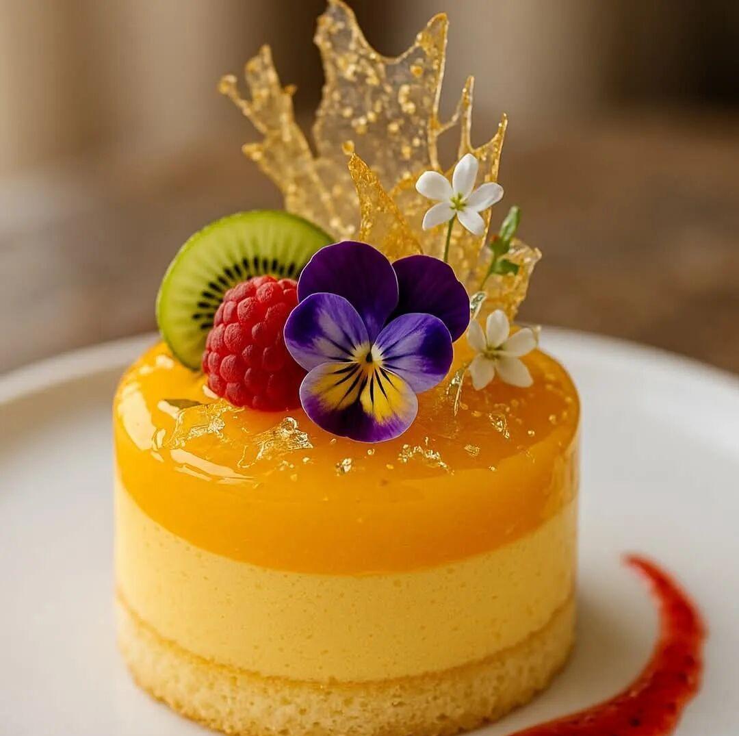 Mango passion fruit mousse with mirror glaze and flower and fruit decoration