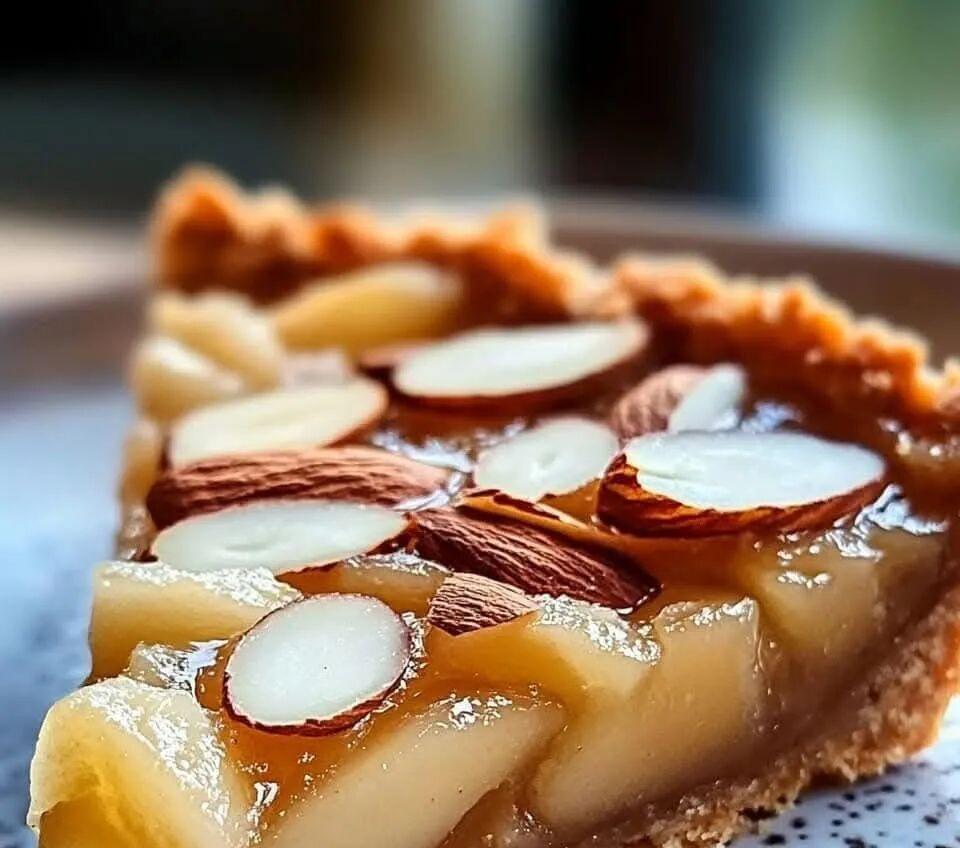 -Place the pear slices on the baked base and pour the egg mixture. Sprinkle with sliced almonds. 🍐 🌰