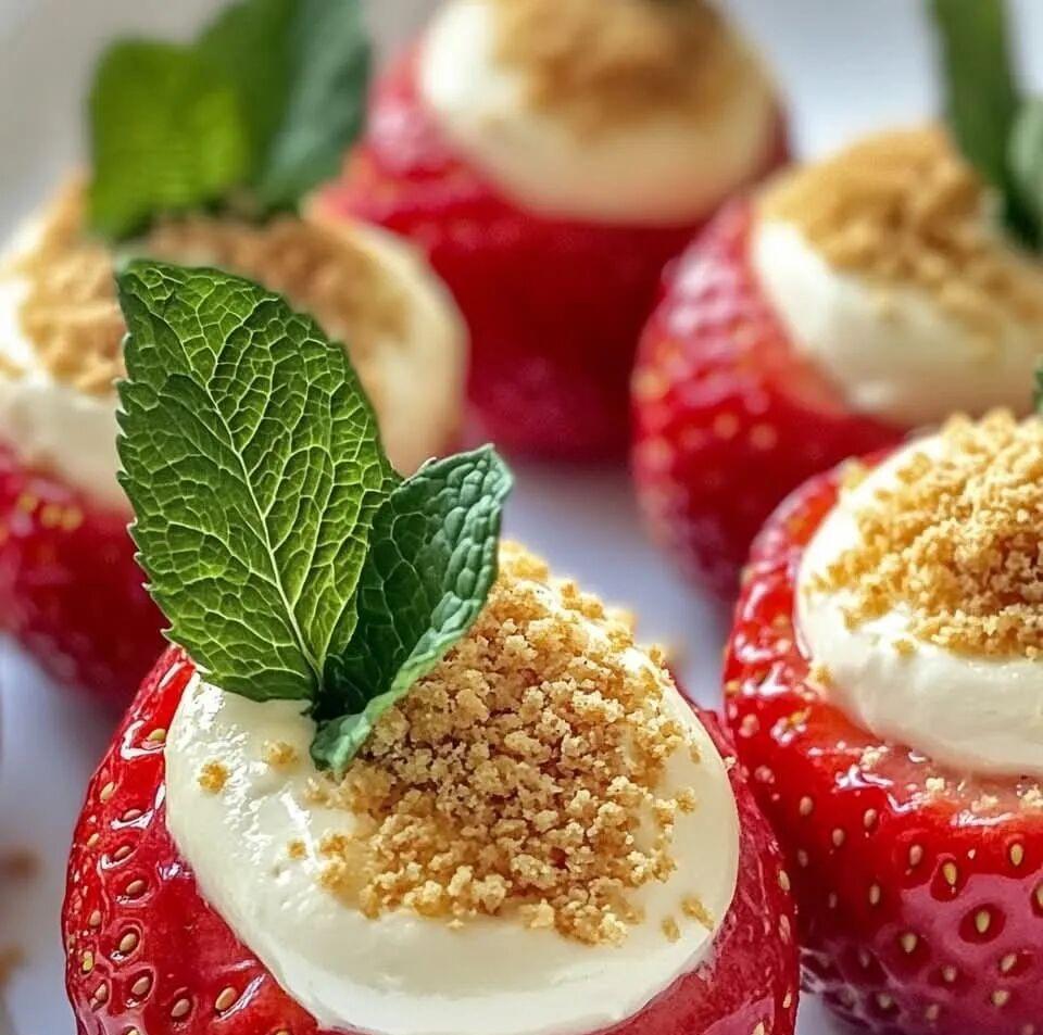 -Stuffed strawberries: Using a piping bag or spoon, carefully fill the cheesecake filling into each strawberry half, making sure to fill.